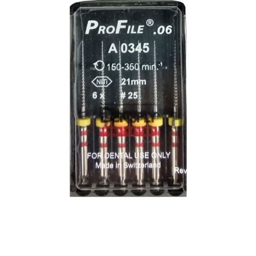 ProFile 06 №25 производства Dentsply (6 шт.) – никель-титановый ротационный инструмент для эндодонтии. Длина 21 мм и конусность 6% обеспечивают точную обработку каналов. U-образное сечение без острых граней хорошо выводит дентинные опилки, а высокая пластичность сплава позволяет манипулировать с изгибами до 90°, минимизируя риск поломки.