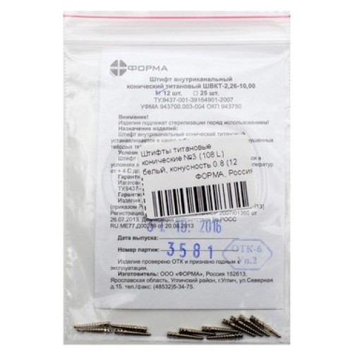 Чтобы заказать титановые штифты № 3 108L, в упаковке по 12 штук от российской фирмы Форма, свяжитесь с нами по почте или телефону. Доставку осуществит курьер или иная подходящая служба доставки, предлагается самовывоз.